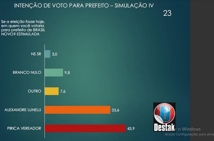 Em um cenário com apenas 2 candidatos, como o que ocorreu em 2016 (quando a disputa foi entre Alexandre e Zé Carlos), Pirica ganharia a eleição para prefeito de Brasil Novo, se a eleição fosse hoje, com quase 44% dos votos.