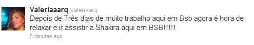 Depois de cumprir uma agenda estafante em Brasília, onde acompanha a prefeita santarena Maria do Carmo, a secretária municipal Valéria Lima (Infraestrutura) resolveu o que vai fazer nesta sua noite de folga: assistir ao show da cantora Shakira.