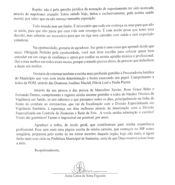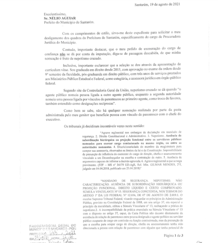 “Sirvo-me deste expediente para solicitar o meu desligamento dos quadros da Prefeitura de Santarém. Contudo, o meu pedido de exoneração do cargo de confiança não se dá por conta da imputação, diga-se descabida, de que a minha nomeação é fruto de nepotismo cruzado”, escreveu.