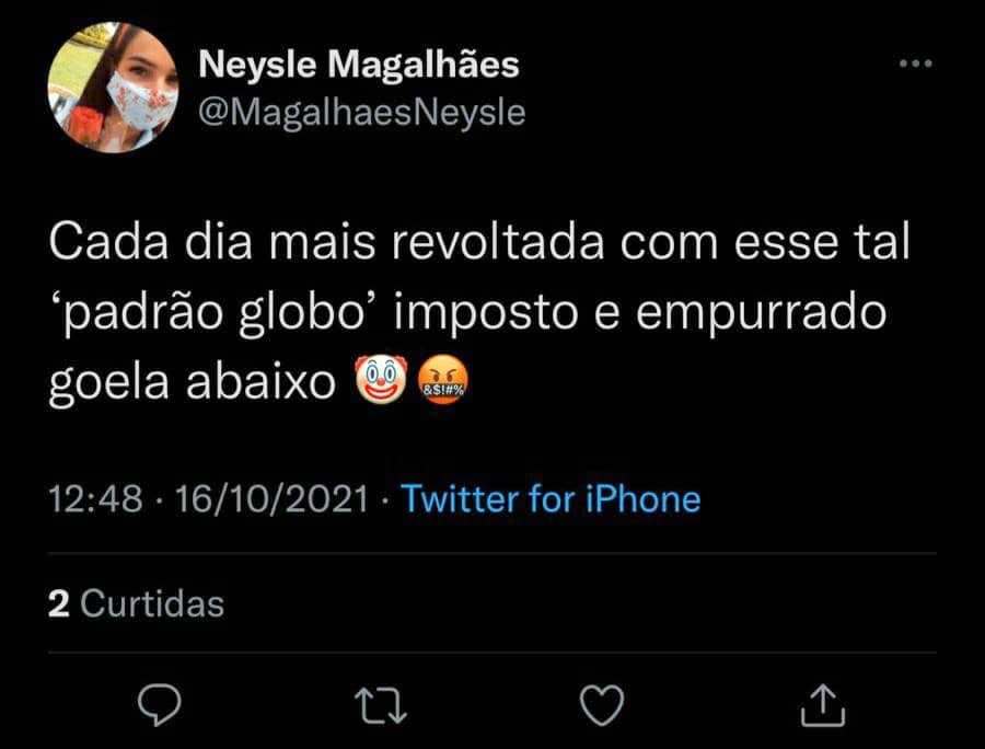 Repórter da TV Tapajós, afiliada da Rede Globo em Santarém (PA), Neysle Magalhães foi as redes sociais neste final de semana e sapecou críticas ao “padrão Globo”, conjunto de regras, implícitas e explícitas, que norteiam as operações e as condutas dos profissionais da emissora no país.