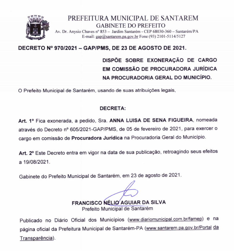 Também na segunda foi oficializada a exoneração da advogada Anna Luísa Figueira – dia em que terminou o prazo de 10 dias dado pelo MPPA (Ministério Público do Pará) para que o prefeito a exonerasse do cargo de procuradora, sob pena de tomar medidas judiciais cabíveis contra Nélio Aguiar por prática de nepotismo cruzado.