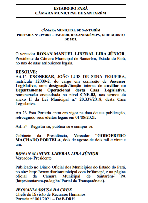 A Câmara de Vereadores de Santarém (PA) exonerou o filho de um dos secretários do prefeito Nélio Aguiar (DEM). O caso foi revelado a partir de denúncia exclusiva publicada no portal BJ há pouco mais de 1 mês.